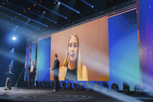 Toiset juhlivat, toiset treenaavat. Urheilugaalaan Helsingin jäähalliin kokoontunut sporttiväki sai kestävyysjuoksija Nathalie Blomqvistin videotervehdyksen harjoitusleiriltä. Blomqvist, 23, palkittiin Urheilugaalassa Läpimurto-palkinnolla.