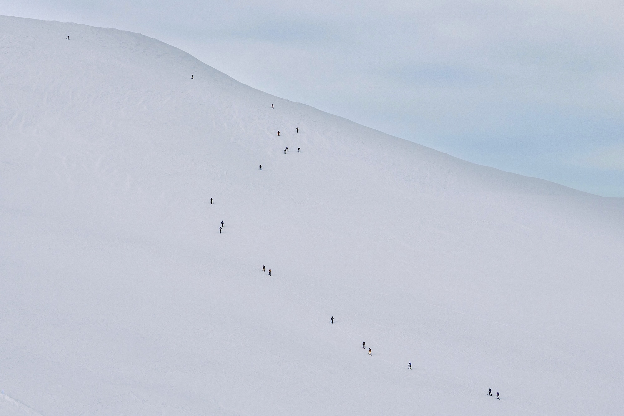 Ensimmäinen skimon eli ski mountaineeringin SM-koitos oli alkamassa. Tunnelma muistutti pikemminkin normaalia isomman porukan vapaalaskuretkeä kuin kilpailua. Seitsemän keroa kavereiden kesken -nimi kuvasi oivasti tapahtumaa.