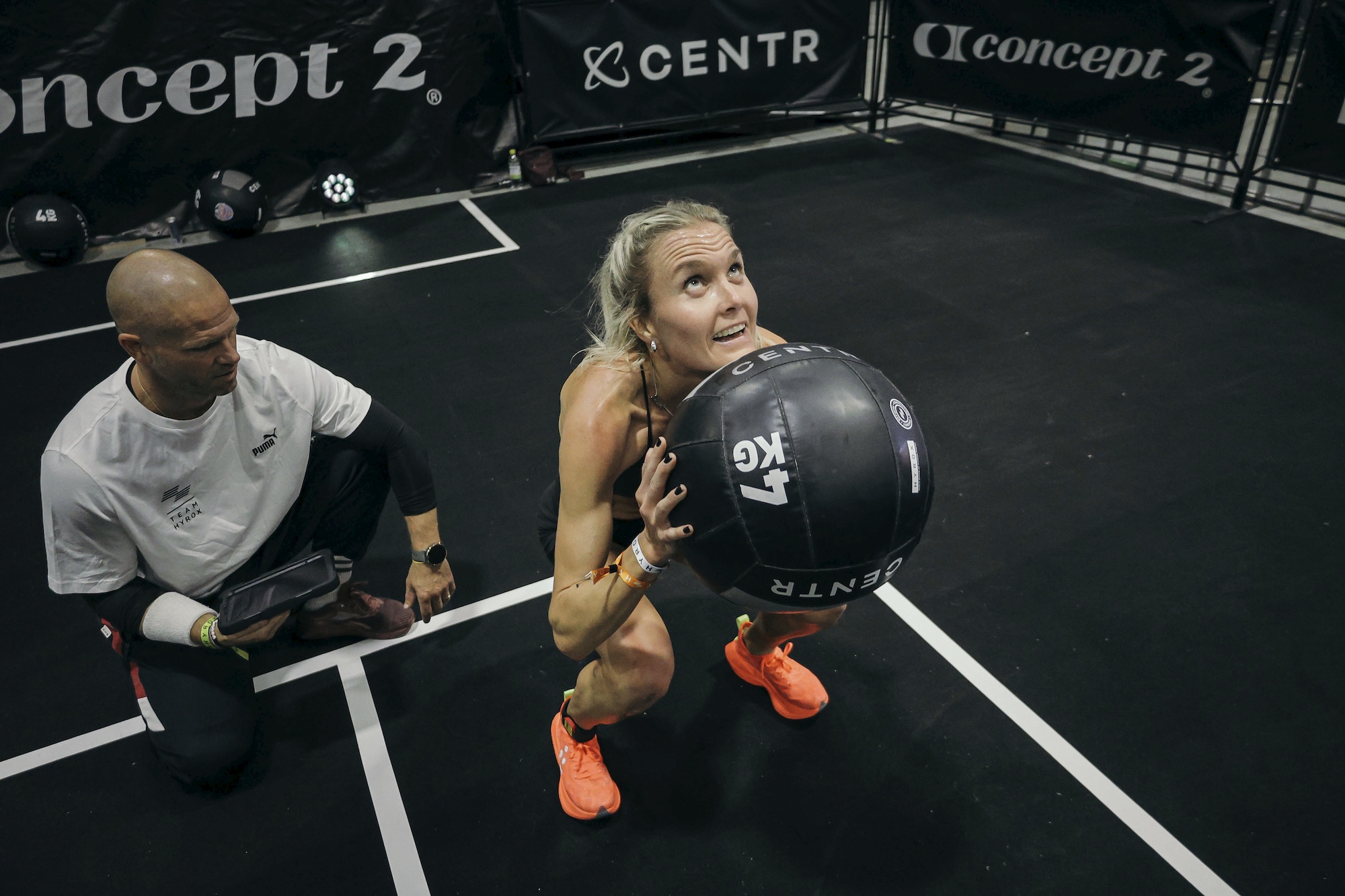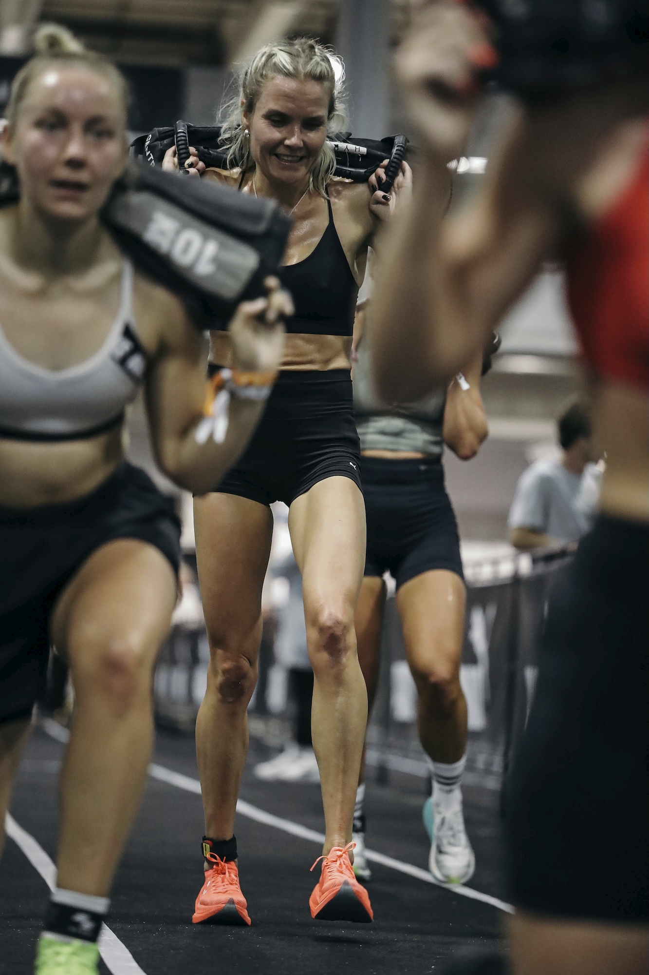 NÄITÄ SEURASIVAT burpee-hypyt (80 m), soutulaite (1 000 m), 16-kiloisten käsipainojen kantaminen, oma suosikkini askelkyykkykävely 10 kg:n painoilla sekä kuntopallon heittäminen seinään (100 toistoa). Kunkin osuuden jälkeen juostiin kilometri.