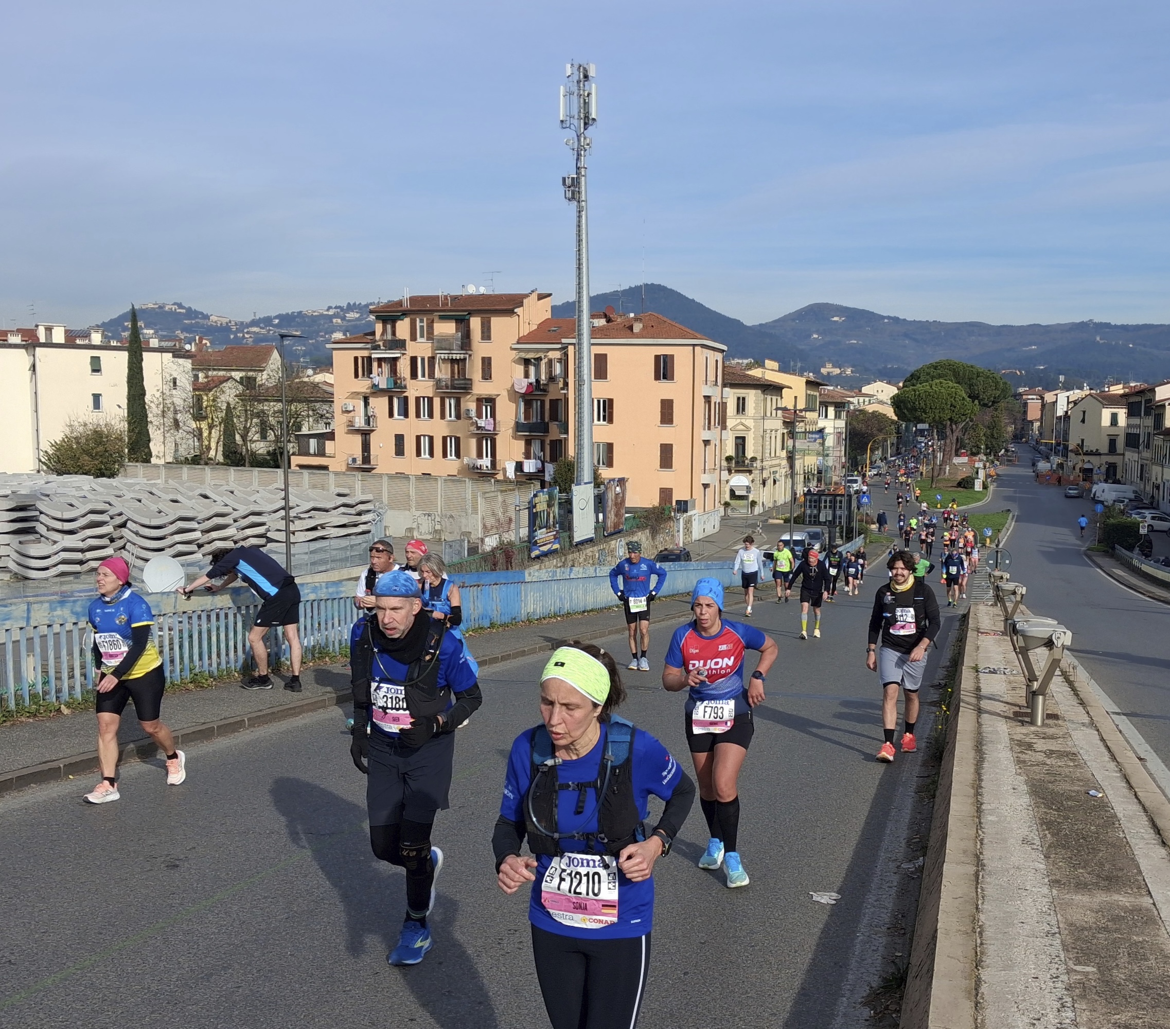 Jaksaa jaksaa -huudot tulivat tarpeeseen maratonin toisella puoliskolla. Tasainen loppureitti piti sisällään pitkiä rautatien vartta kulkevia suoria ja maisematkaan eivät virikkeitä tarjonneet. Poikkeuksena oli hieman kolmenkympin jälkeen tullut yleisurheilustadionin juoksuradan kierto. Vieressä olisi ollut Firenzen jalkapallopyhättö, tällä hetkellä Italian Serie A:n häntäpäässä majailevan ACF Fiorentinan kotistadion, mutta sen juoksijat ohittivat ulkopuolelta.