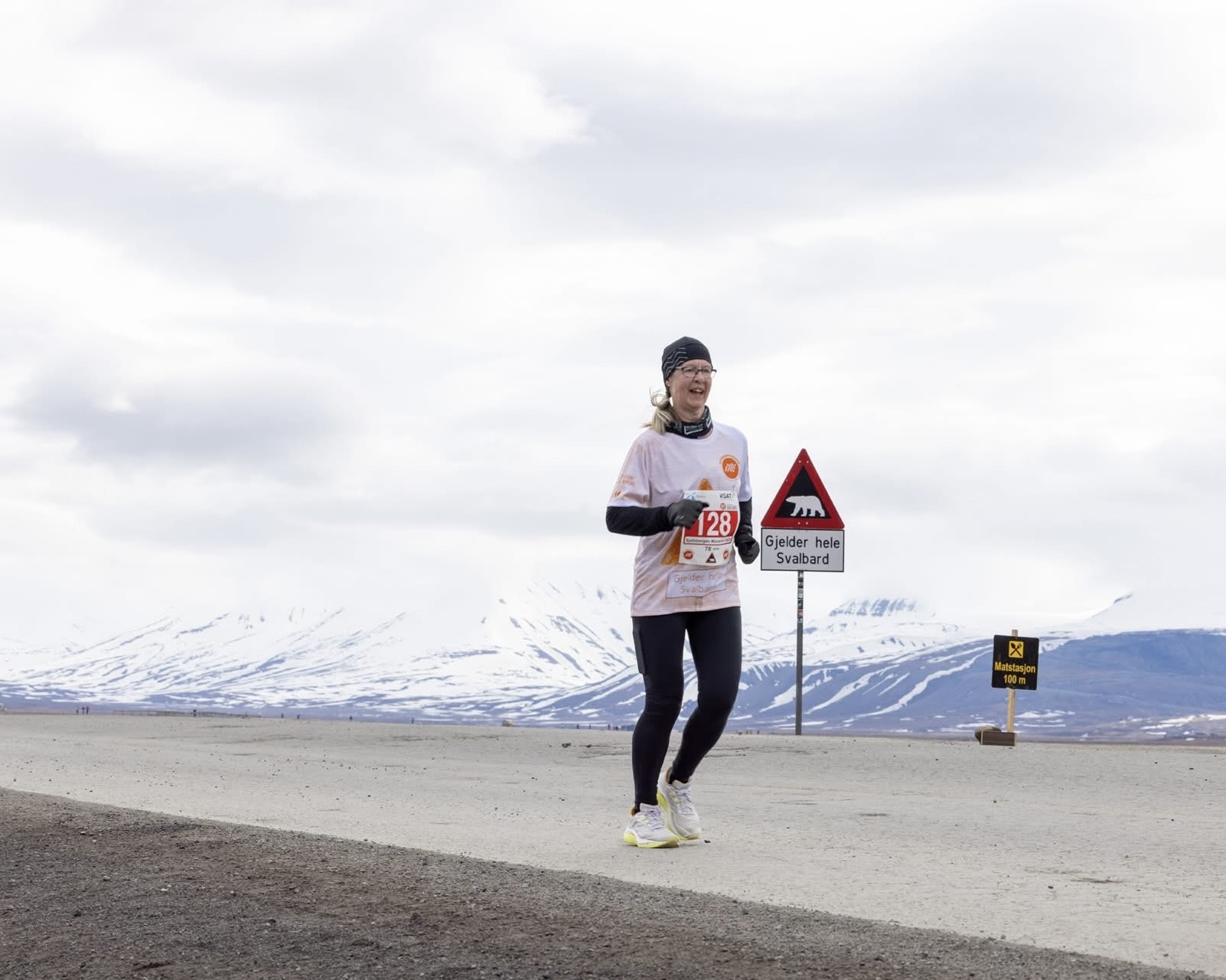 Pia Nykänen Spitsbergen maratonilla Huippuvuorilla 2025.