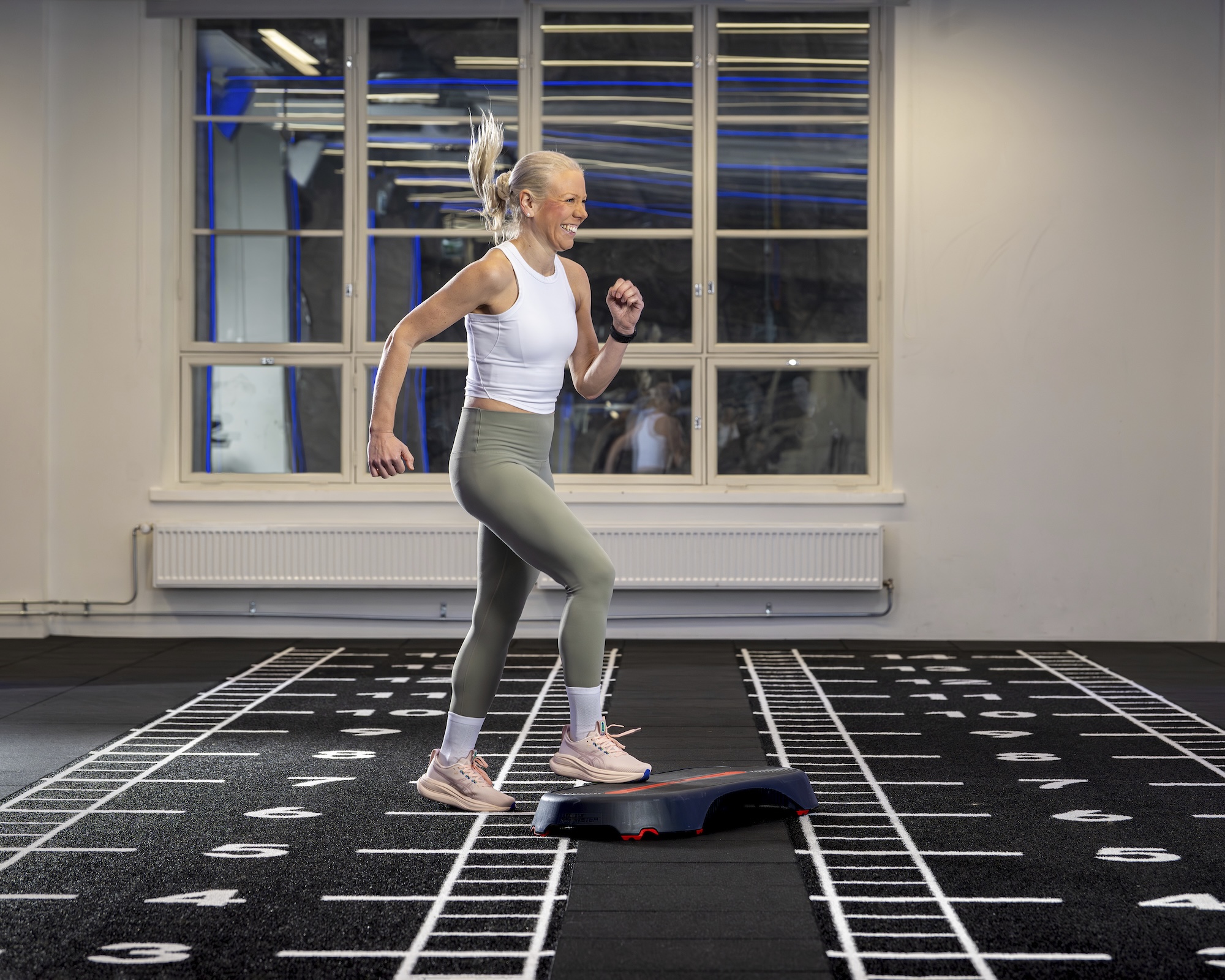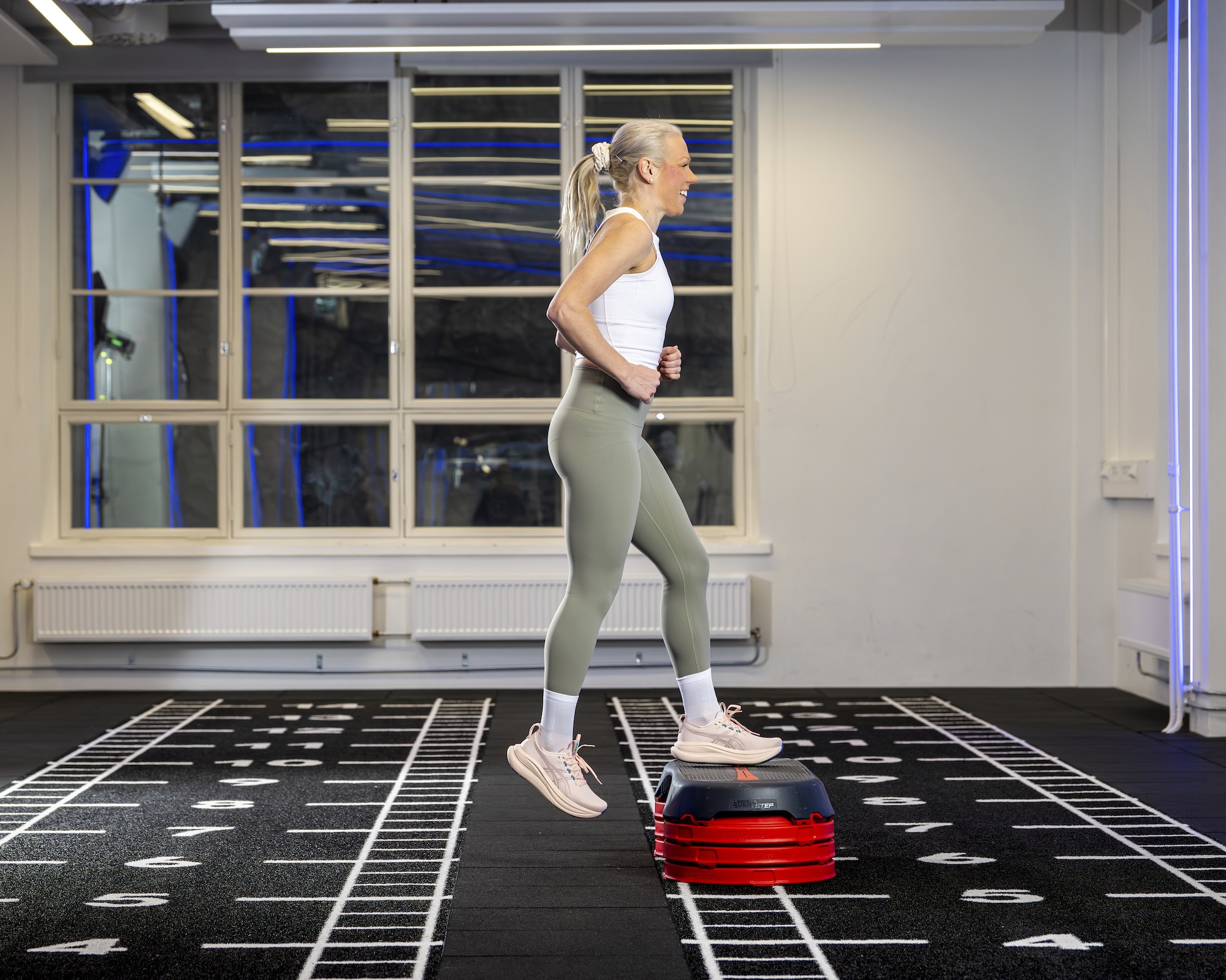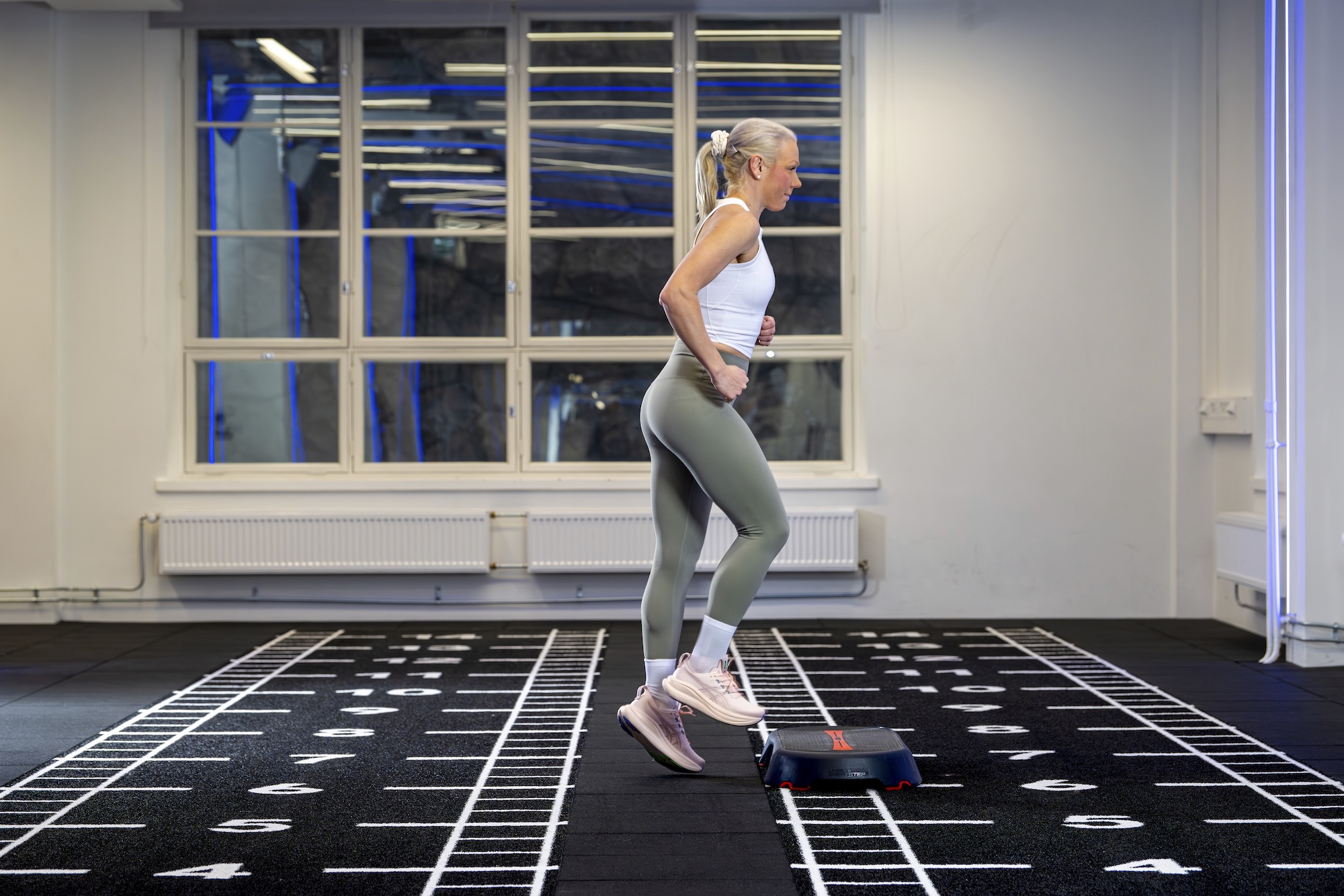 Ota aloitusasento niin, että koroke on jalkojesi välissä. Juokse vuorotellen oikea ja sitten vasen jalka mahdollisimman nopeasti tasolle ja alas.