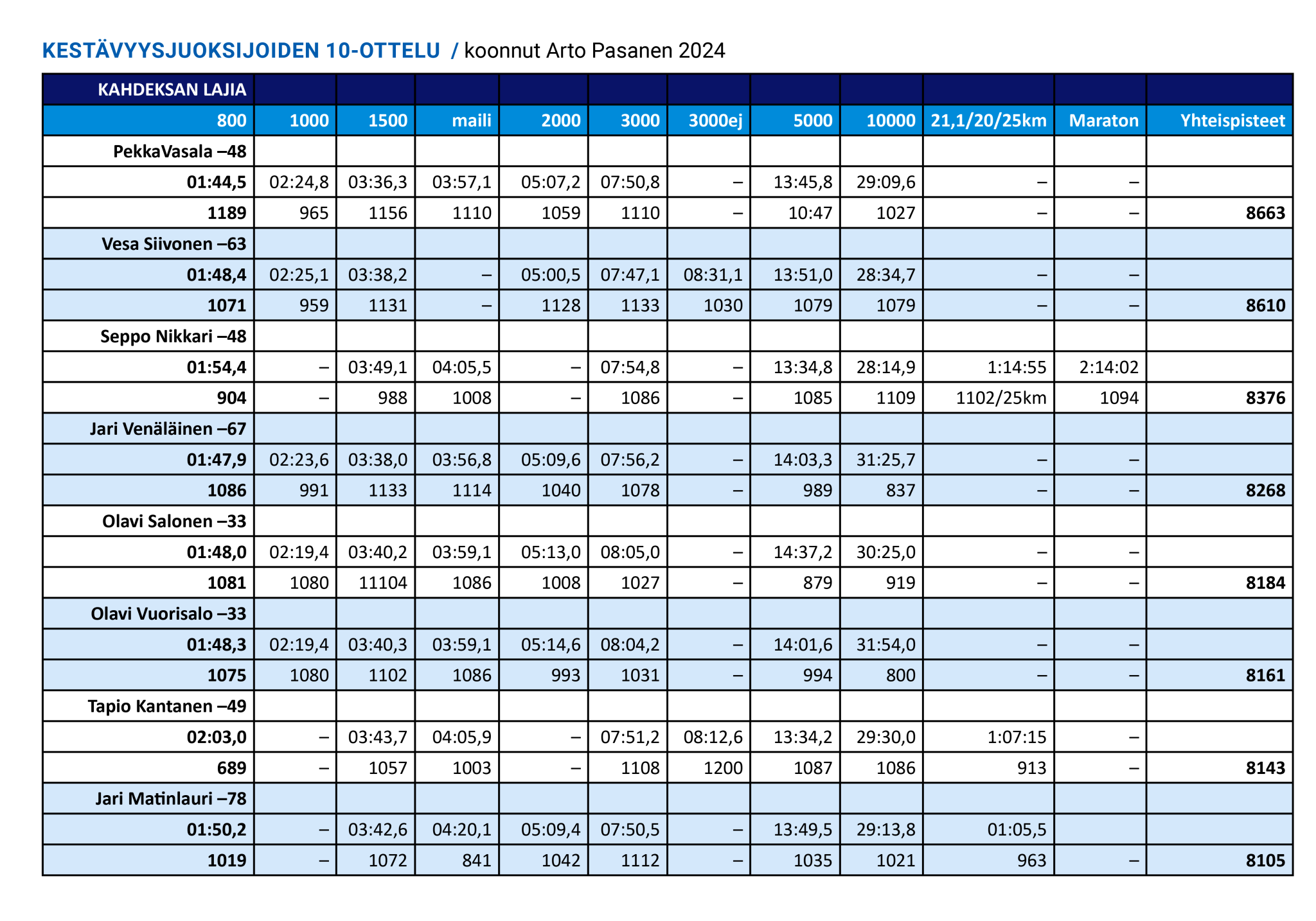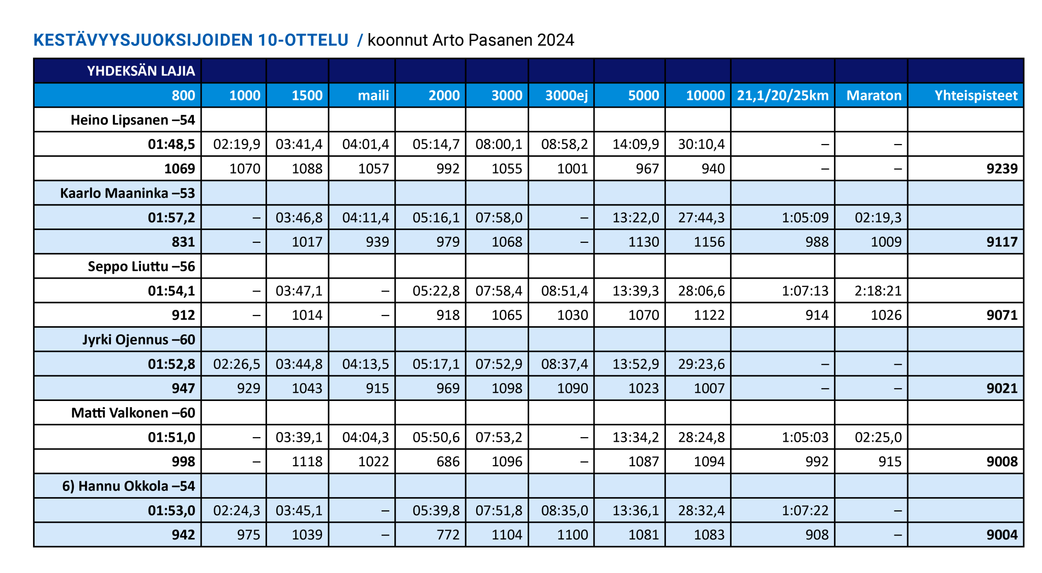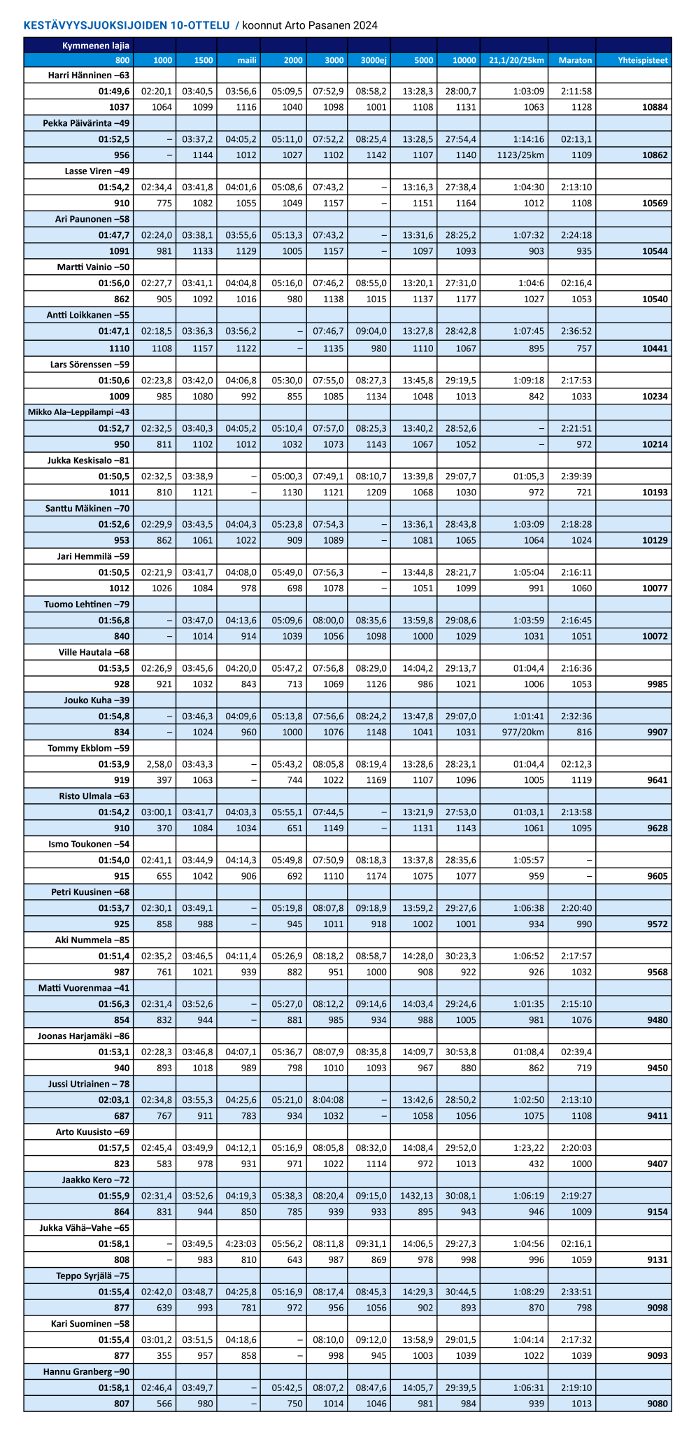 Pasasen tilastoinnissa kestävyysjuoksijoiden kymmenottelun ”aatelisrajana” voidaan pitää keskiarvoisesti vähintään 1000 pisteen saavuttamista per laji eli kokonaispisteiden nousemista yli 10 000:n. Ylle kirjatun kärkikymmenikön lisäksi tähän ovat yltäneet vuonna 1959 syntynyt Jari Hemmilä ja häntä 20 vuotta nuorempi Tuomo Lehtinen.