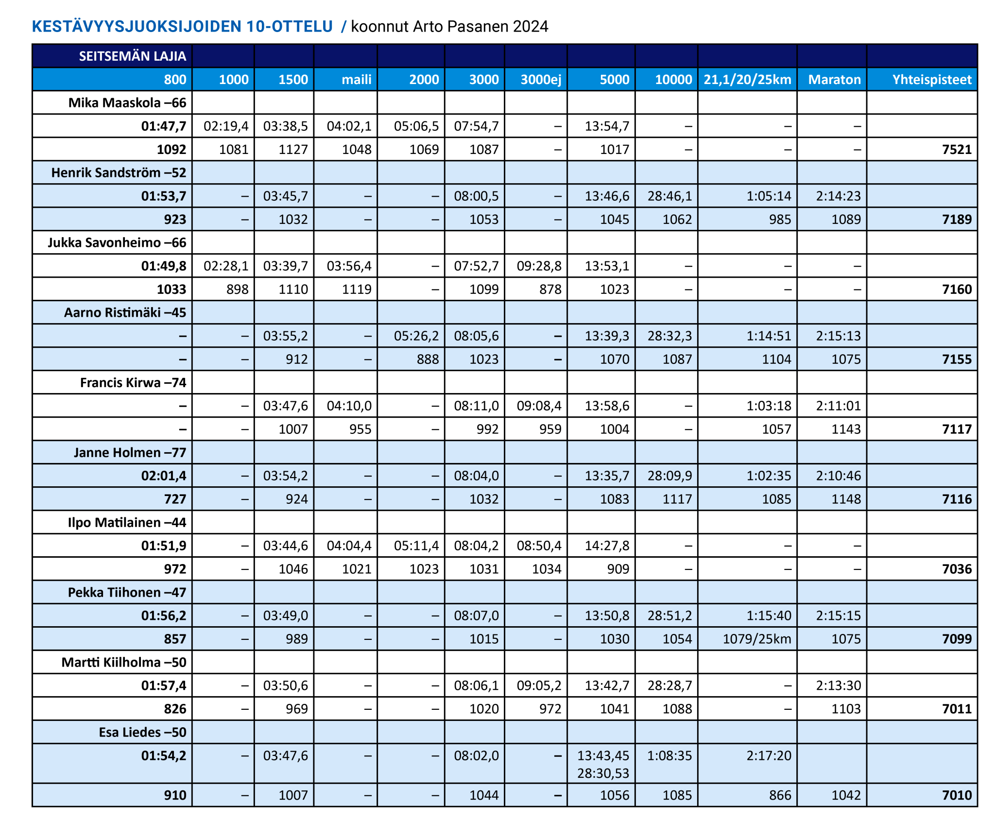 Seitsemän lajin ennätystulosten kirjauttajia tarkasteltaessa löytyy 1000 keskiarvopisteen per laji paremmalta puolelta kymmenikkö, joka painottuu pitkien rata- ja maantiematkojen juoksijoista. Tämän listan kärkeen kiilaa kuitenkin maileri Mika Maaskola (1074), muut ovat Henrik Sandström (1027), Jukka Savonheimo (1023), Aarno Ristimäki (1022), Francis Kirwa (1017), Janne Holmén (1017), Ilpo Matilainen (1005), Pekka Tiihonen (1005), Martti Kiilholma (1002) ja Esa Liedes (1001).