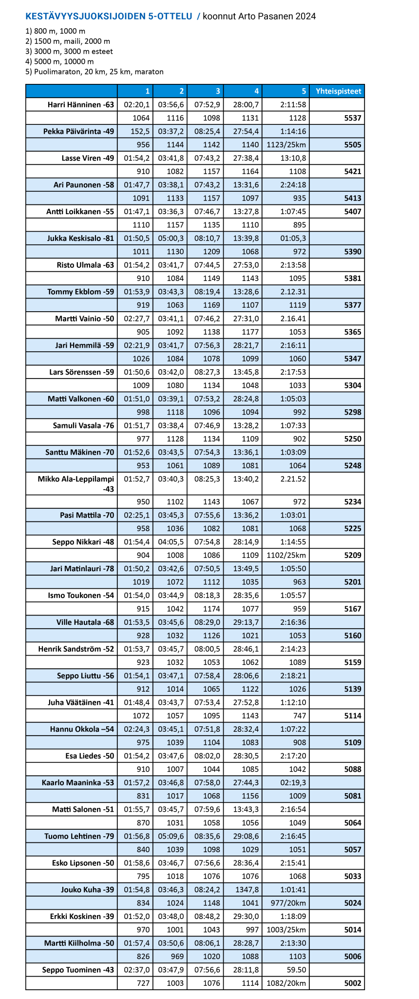 Pasanen kartoitti lisäksi kestävyysjuoksun parhaat ”viisiottelijat” siten, että kunkin urheilijan on pitänyt kirjauttaa ennätystulos oheisesta valikosta, josta kullekin on otettu huomioon eniten pisteitä tuottava ennätysnoteeraus, Viisiportainen valikko on; 1) joko 800 tai 1000 m, 2) 1500 m, maili tai 2000 m, 3) 3000 m sileänä tai esteillä, 4) 5000 tai 10000 m ja 5) puolimaraton, maraton, 20 km tai 25 km radalla.