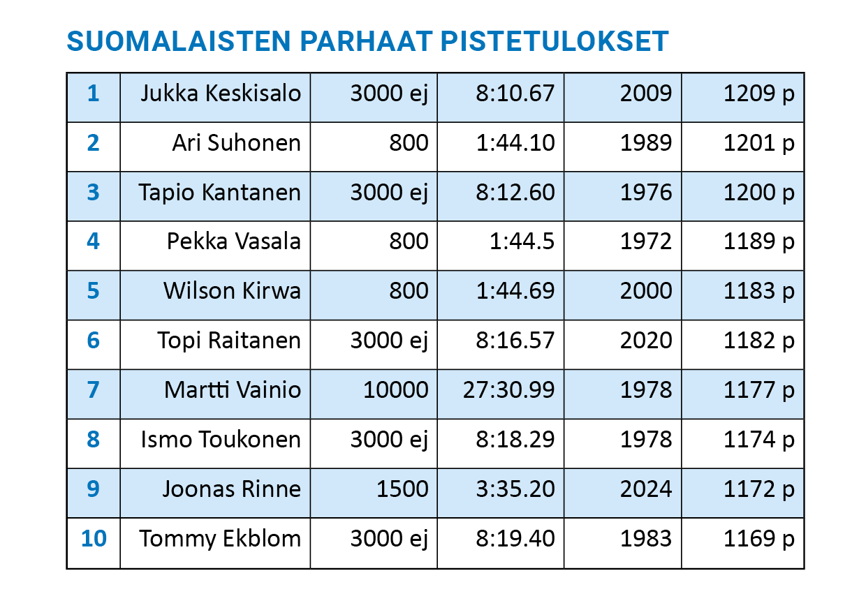 Kansainvälisen pistetaulukon mukaan Suomen kovin kestävyysjuoksutulos on Jukka Keskisalon esteiden Suomen ennätys 8.10,67. 1200 pisteeseen yltävät lisäksi Ari Suhonen kasin SE:llään sekä Tapio Kantanen Montrealin olympialaisissa silloisella esteiden SE:llä. Parhaiden kestävyysjuoksutulosten kymppikärjessä on lisäksi kolme estejuoksutulosta, kaksi tulosta kasilta ja Rinteen sekä Vainion SE:t tonnivitoselta ja kympiltä.