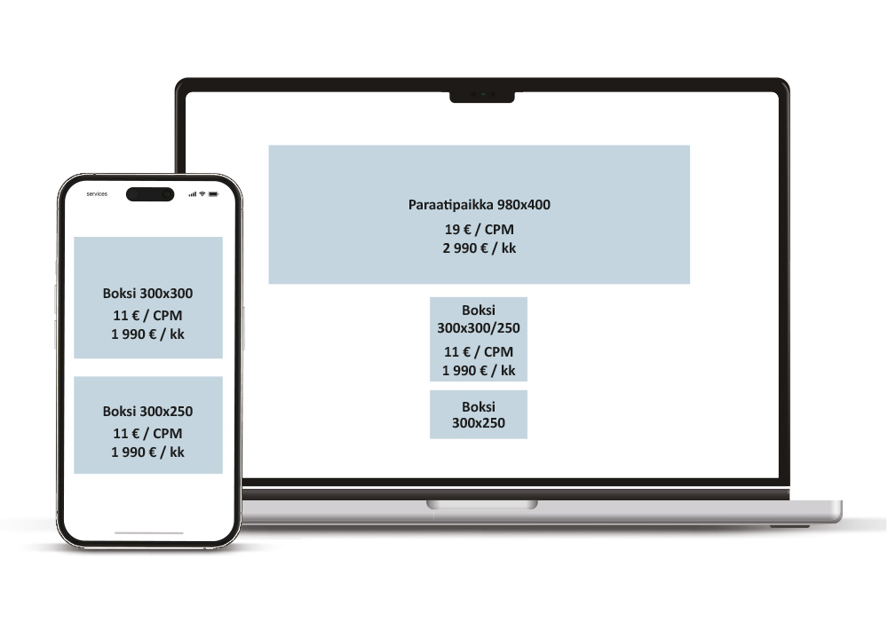 | Boksi, desktop | 300 x 300/250 | 11 € | 1 990 € | Etusivu, lajisivut, artikkelisivut |