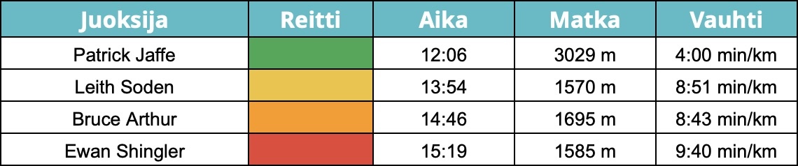 Rastivälin nopein juoksija Patrick Jaffe antaa tähän kysymykseen vastauksen. Hänen juoksemansa matka on lähes tuplasti pidempi kuin rastivälin suoraan juosseilla, kun taas vastaavasti juoksuvauhti on yli tuplasti nopeampi – valinta, jota meillä päin on kutsuttu tämän palstan entisen kirjoittajan mukaan ”Haikosen harpiksi”. Kun jalkojen alle saa lähes koko matkan tietä ja samaan aikaan välttää kaikki nousumetrit, voi näinkin suuri kiertoreitti kannattaa.