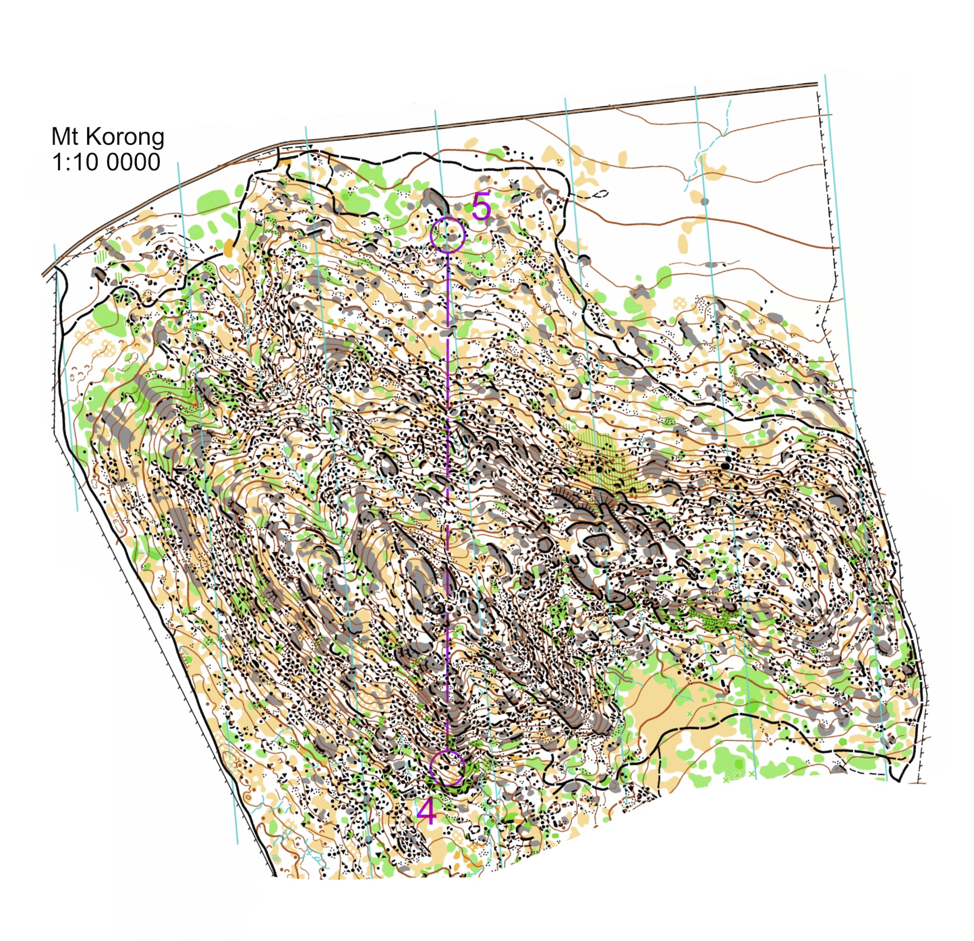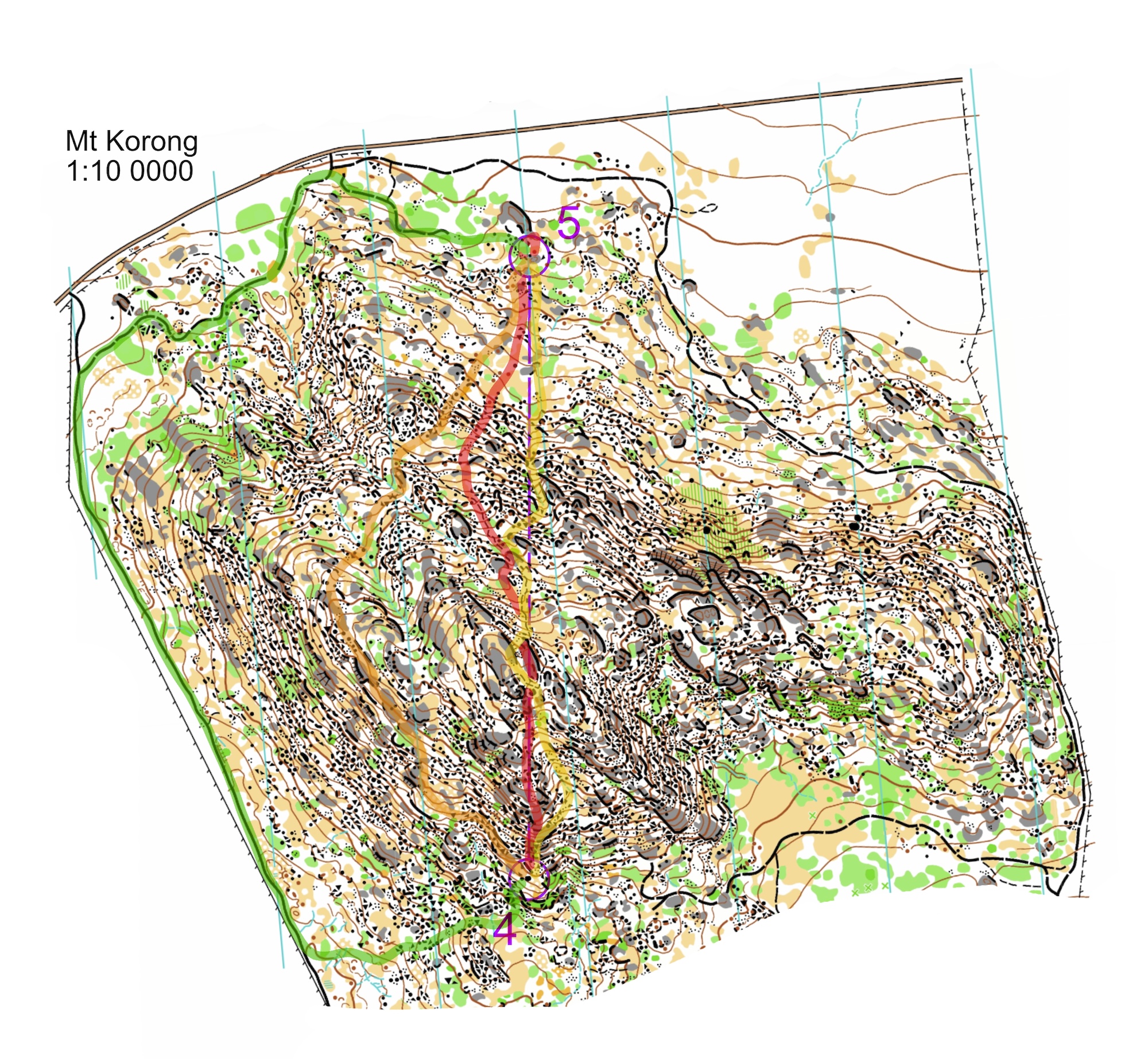 Miesten pitkän matkan rastiväli 4–5 tarjoaa sellaisia haasteita, joihin Suomessa on hyvin vaikea valmistautua. Rastiväliviiva halkaisee Suomen mittapuulla käytännössä vuoren, ja rastilta lähtiessä eteen kohoaa yli sadan metrin lähes pystysuora nousu. Oman mausteensa reitinvalintoihin tuovat hiekka- ja liuskekivimuodostelmat, joita rinteet ovat täynnä. Haasteena onkin arvioida, miten isot kierrot tässä maastossa kannattavat.