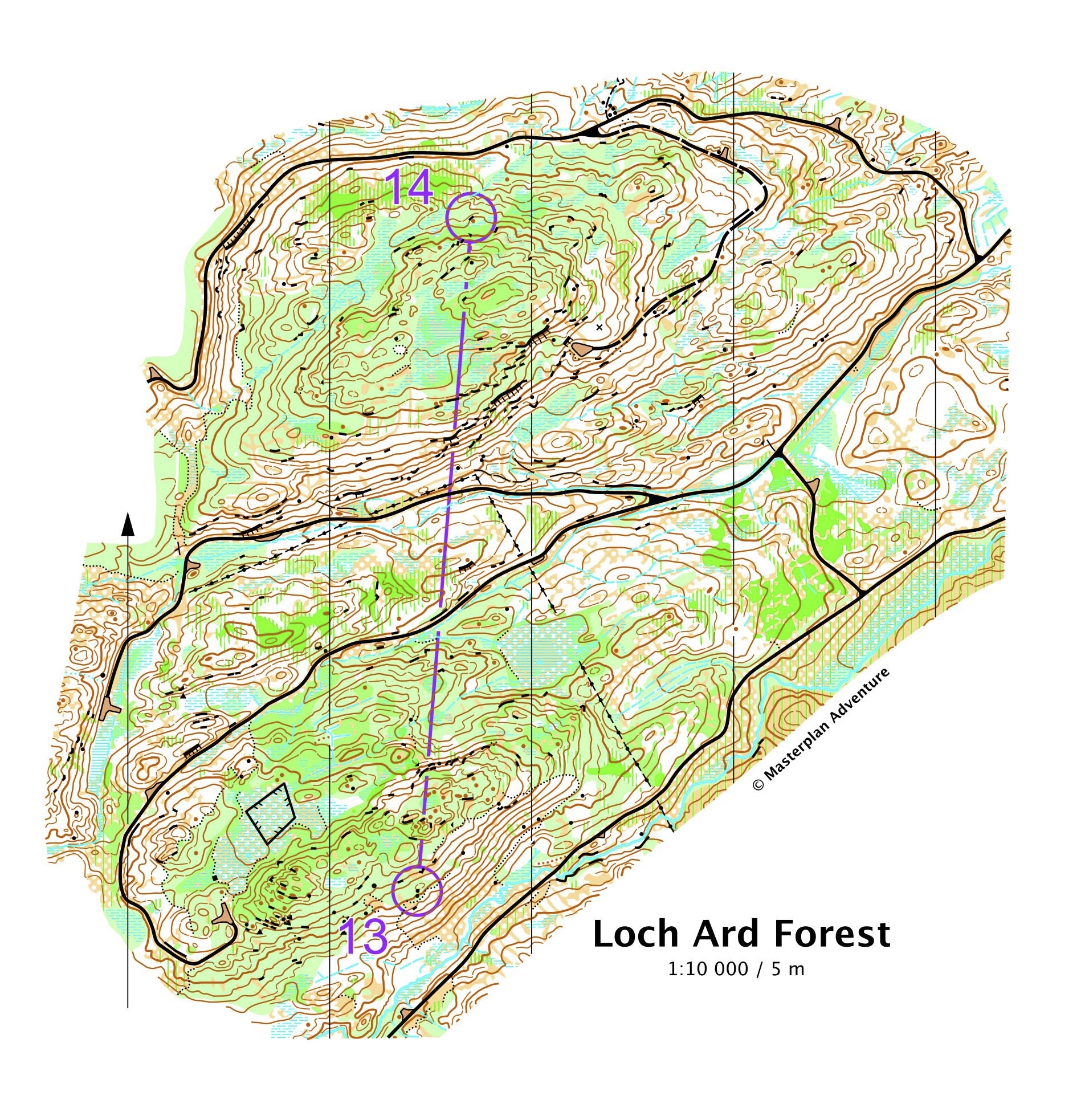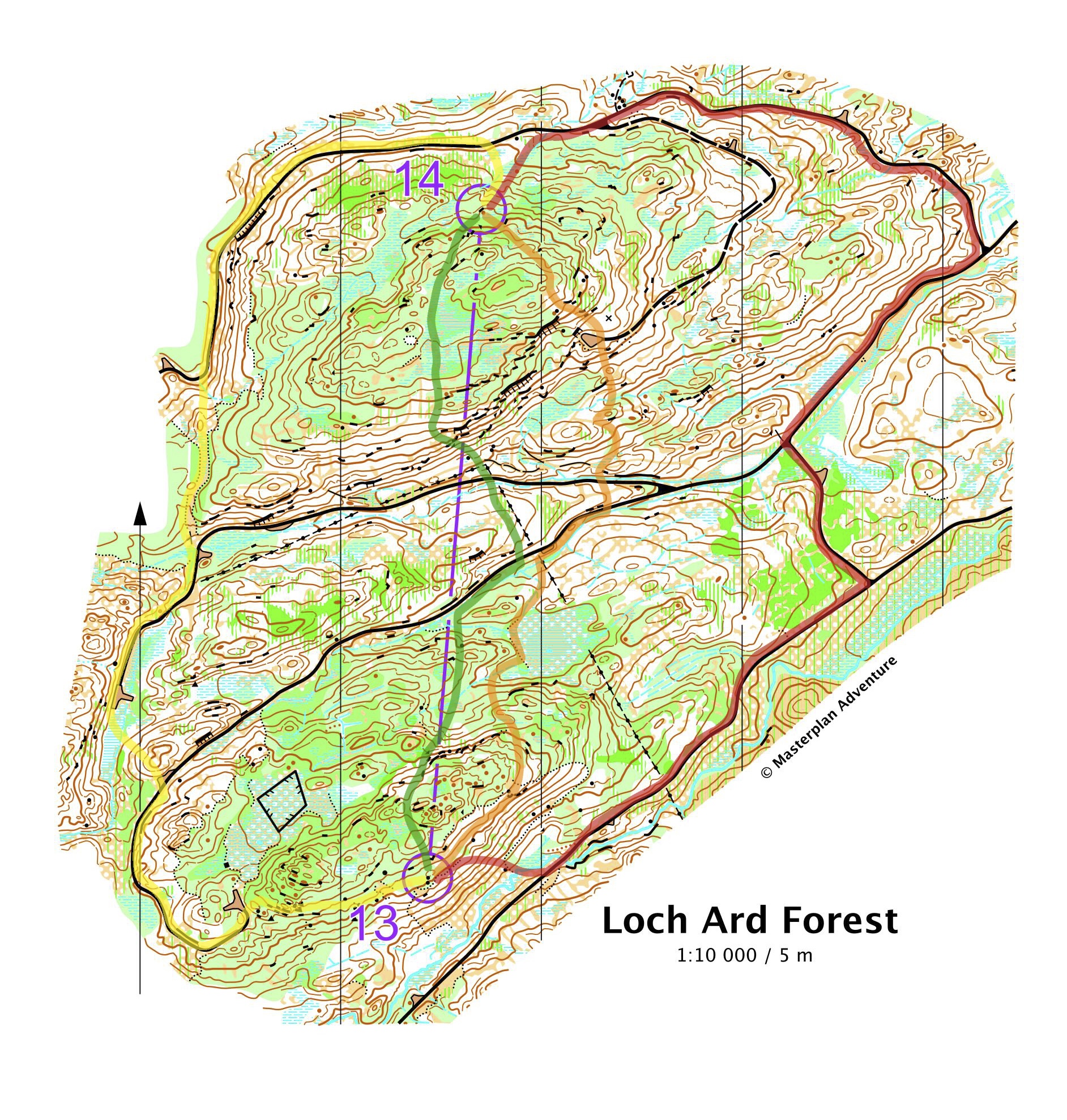 Palataan kalenterissa takaisin viime vuoteen ja lokakuuhun. Skotlannissa kilpailtiin JEC eli Junior European Cup, joka on nuorten arvokilpailujen jälkeen kenties kovin kilpailu nuorten sarjoissa. Maastomatkoat juostiin kuninkaallisissa tunnelmissa Queen Elizabeth Forestin maastossa, joka nätistä nimestään huolimatta tarjosi välillä aika rajuakin risukkoa. Tämän kerran ratamestarin erikoisessa tarkasteltavalla M20-sarjan rastivälillä 13–14 suunnistajan eteen tuleekin kaikkia vihreän eri sävyjä. Tähän yhtälöön kun lisätään vielä maaston suuret korkeuserot, on edessä varsin haastava ongelma ratkaistavaksi.