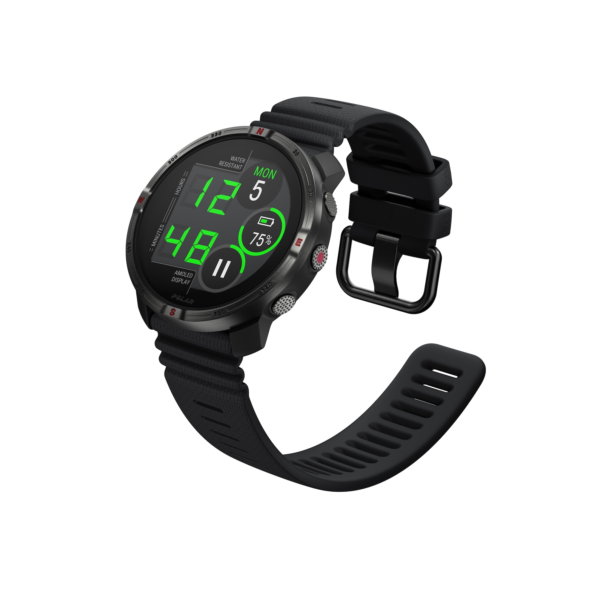 Polarin amoled-näyttö on selkeä ja riittävän kirkas jo oletusasetuksella. Näytön herättäminen vaati harvakseltaan uuden yrityksen juostessa.