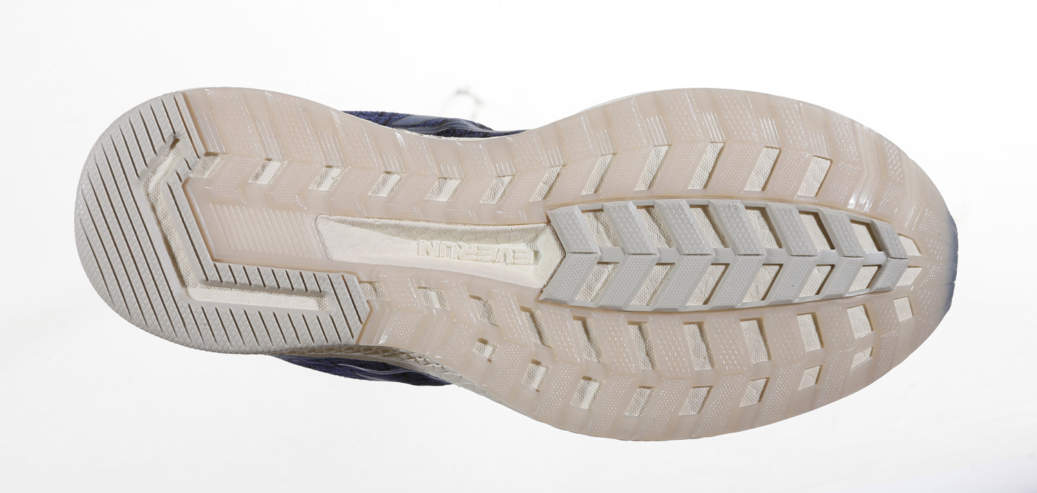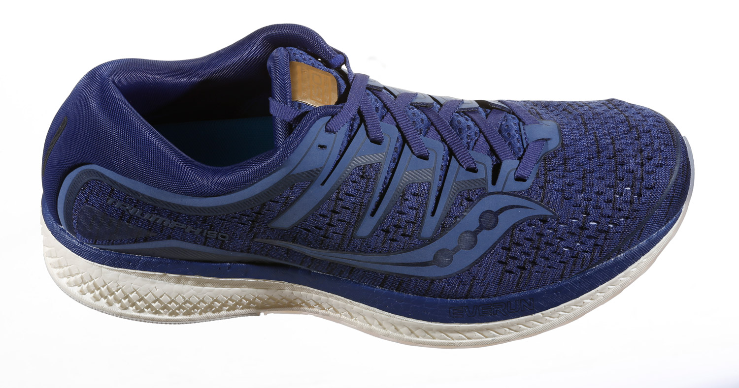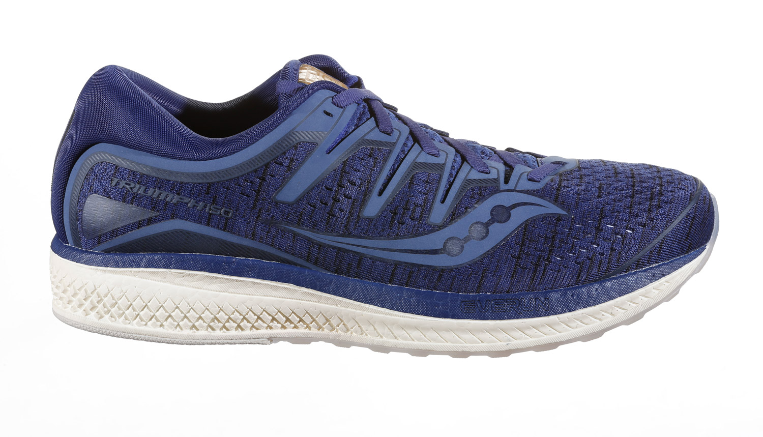 Triumphin kaksiosainen välipohja näyttää massiiviselta. Kantapää on 8 milliä päkiää korkeammalla. Päällinen on yhtenäistä ja sukkamainen, jota hallitsee Sauconyn ISO-nauhoitussysteemi. Kantakuppi on muhkeasti muotoiltu.