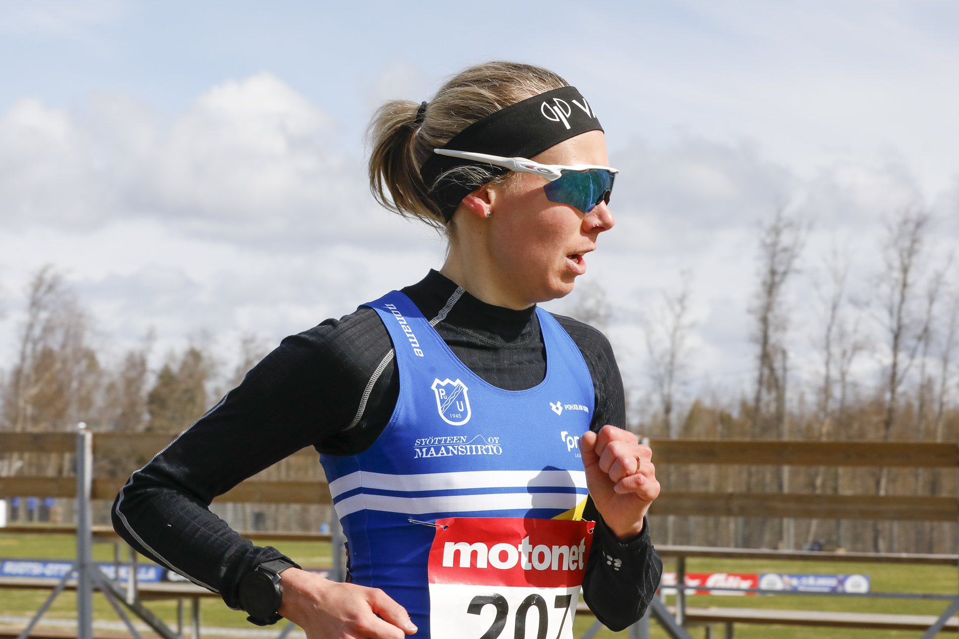 Turun Urheiluliiton Aino Suni puolustaa naisten pikamatkan mestaruuttaan.